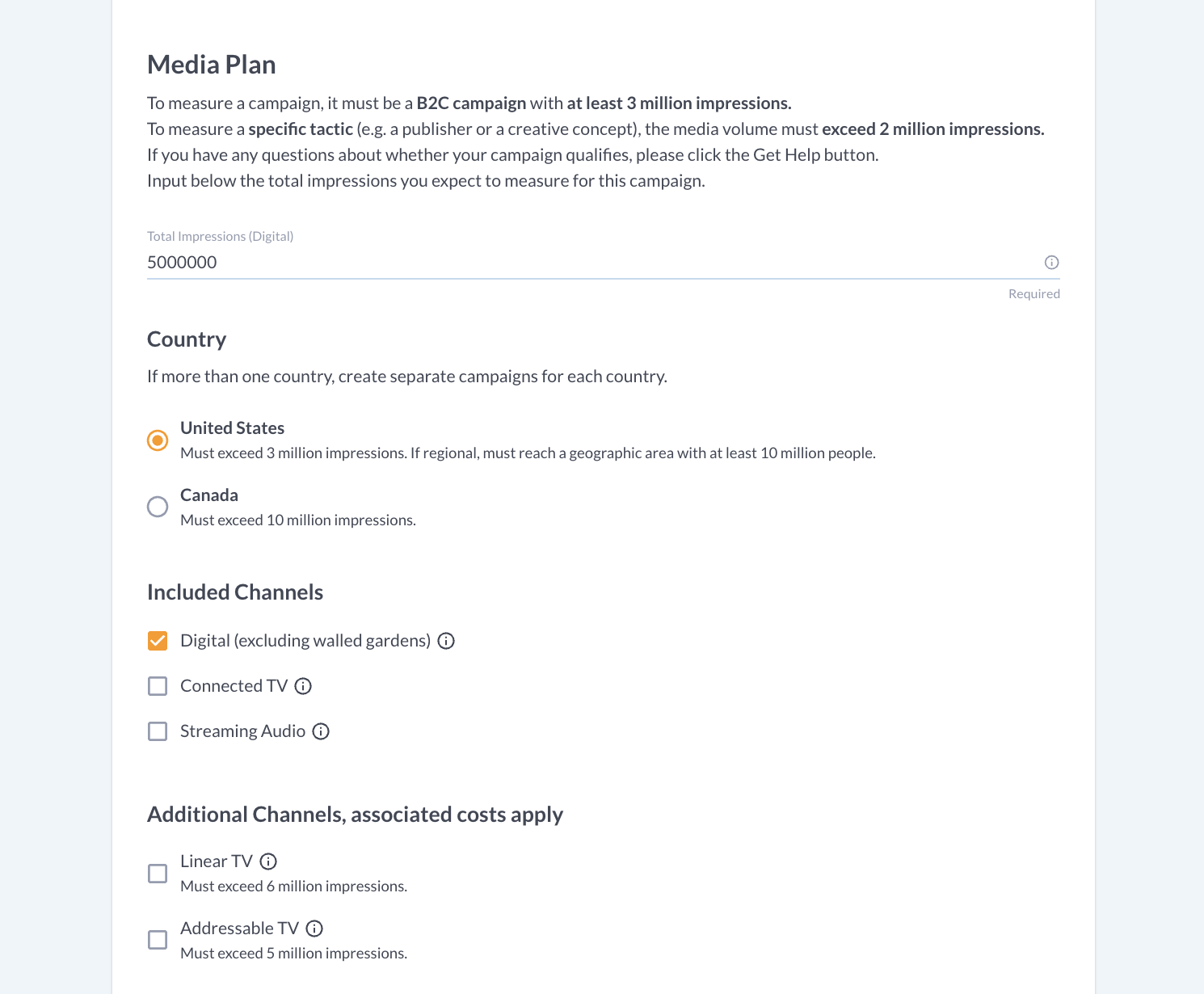 Important! Input Media Channels that you're expecting to measure on this campaign. This field gives us important information that could impact campaign setup.