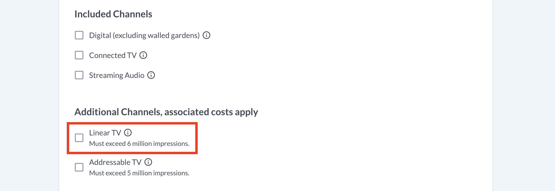Under "Additional Channels", be sure to select "Linear TV". This tells us that you intend on measuring Linear TV on your study.