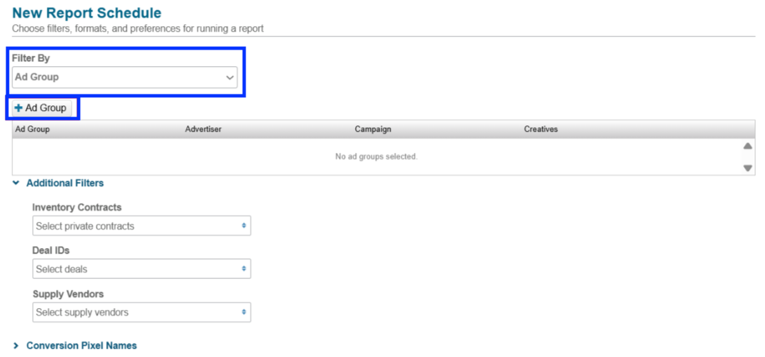 Please note: Impression reporting should only reflect units that you intend for Upwave to measure. In some cases, this may require filtering for specific Ad Group IDs. You can do that using the setting below: