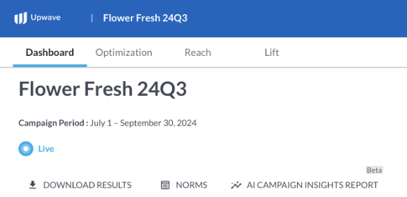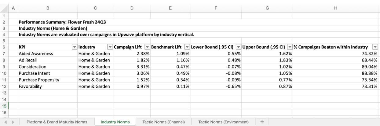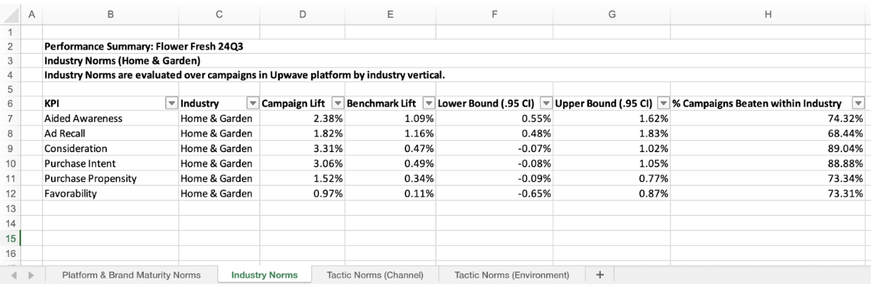Upwave provides you with different types of norms so you can contextualize the brand lift performance in ways that work for you. When contextualizing lift for your whole campaign you can use Industry Norms.