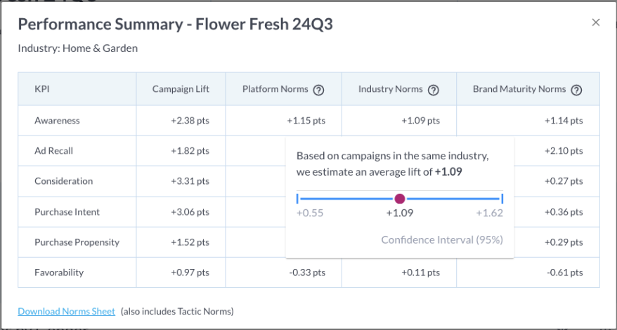 In the modal, you can see Industry Norms - along with Platform Norms and Brand Maturity Norms - for available KPIs measured on your campaign, alongside your campaign’s lift. Hover over the norms to see the confidence interval.