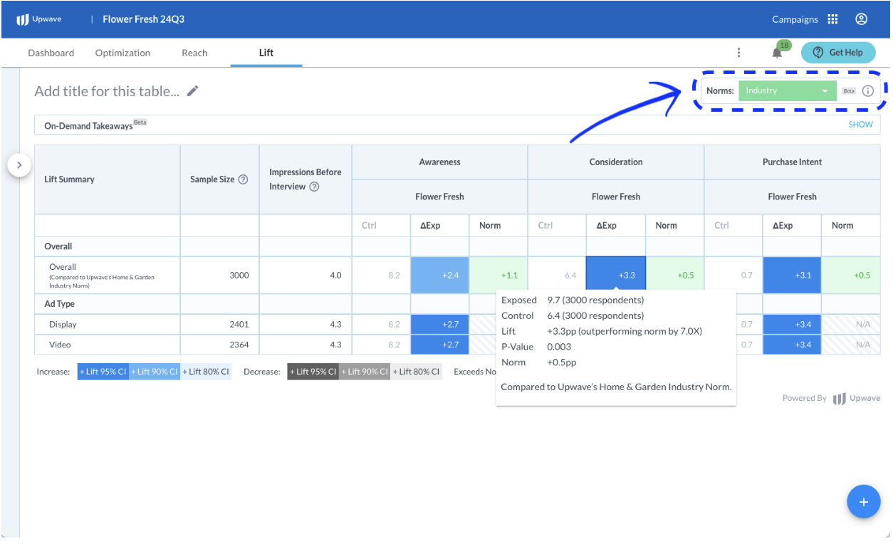 Industry Norms can be viewed in lift tables, for faster, easier interpretation of your brand lift performance. Click the norms toggle above the upper right corner of a lift table and select Industry to display in a norms column that shows Industry Norms for the overall cut (no norms for other cuts).